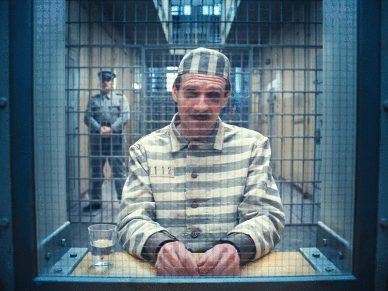 Gustave talking to Zero who is off screen, but he leans into range of the mirror. All the while, the subject of the conversation is dead center of the shot (the painting).